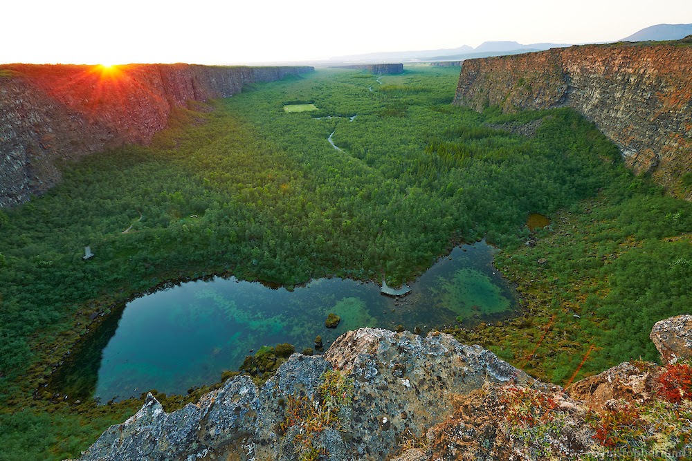 Ásbyrgi es una maravilla de la naturaleza, un inmenso cañón en forma de herradura con acantilados enfrentados de hasta 100 m de altura. Es un gigante es 3,5 km de largo y más de 1 km de ancho. En su extremo interior se encuentra Botnstjörn, un pequeño estanque, rodeado de exuberante vegetación. Y por último una formación de rocosa conocida como Eyjan (la isla) se eleva desde el centro de Ásbyrgi, hasta 250 m de ancho.