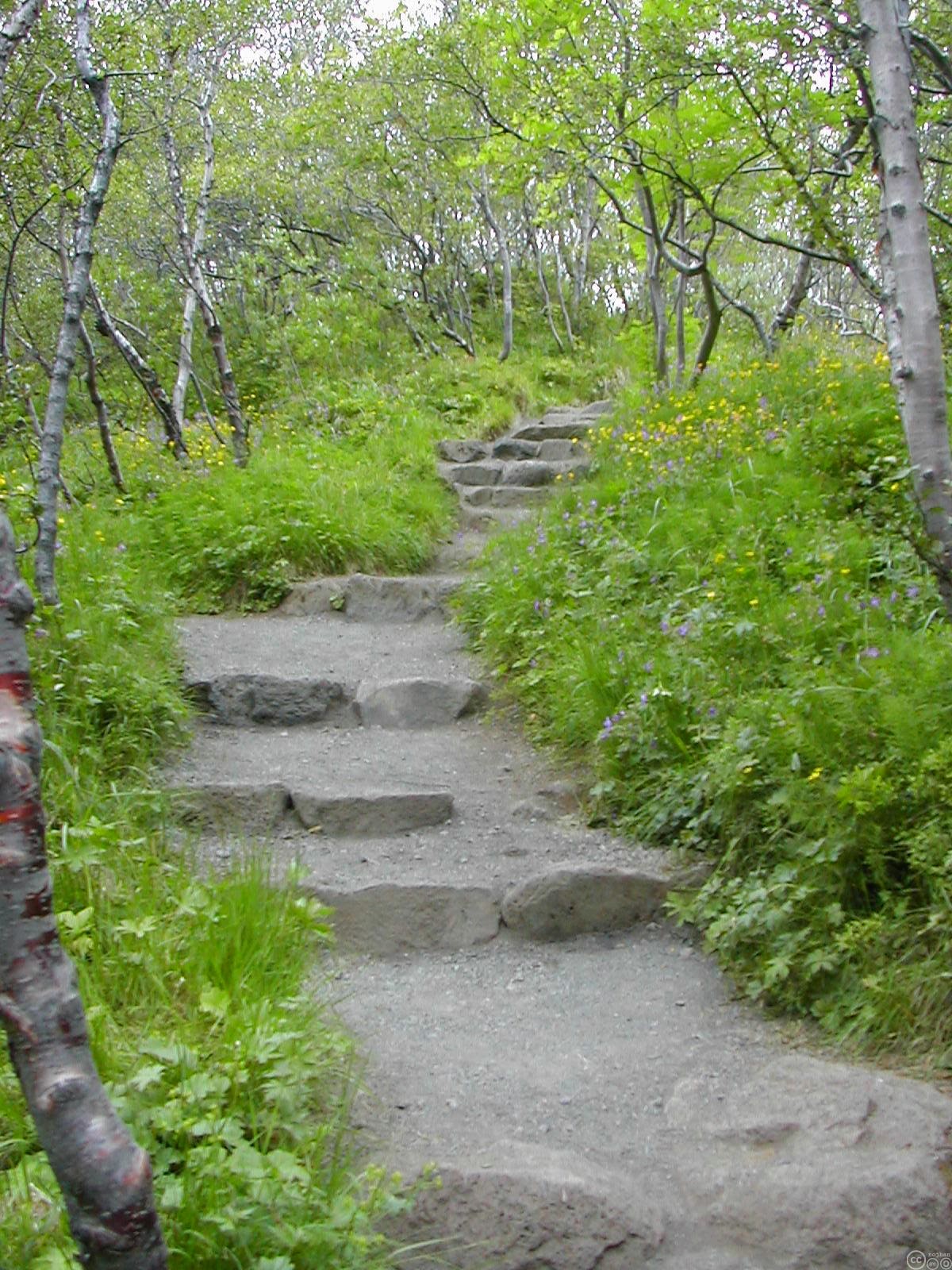 Desde aquí el camino va hacia el oeste pudiendo observar todo tipo de arbustos característicos de esta zona norte de Islandia hasta que termina en un viejo campo de juego en Ásbyrgi.