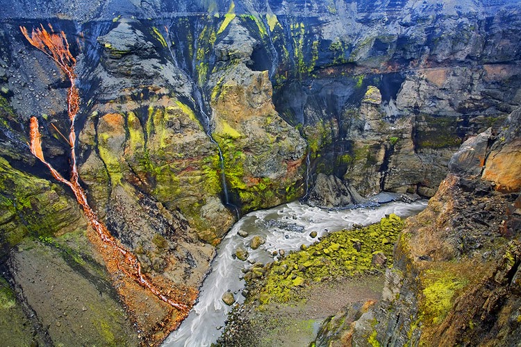 Después de 45 minutos de pista, un empinado sendero conduce hacia el cañón del rio Syðri-Emstruá que luego se puede cruzar por un puente espectacular. Una cuerda ayuda a superar los últimos metros de la bajada empinada, así que ten cuidado por favor.