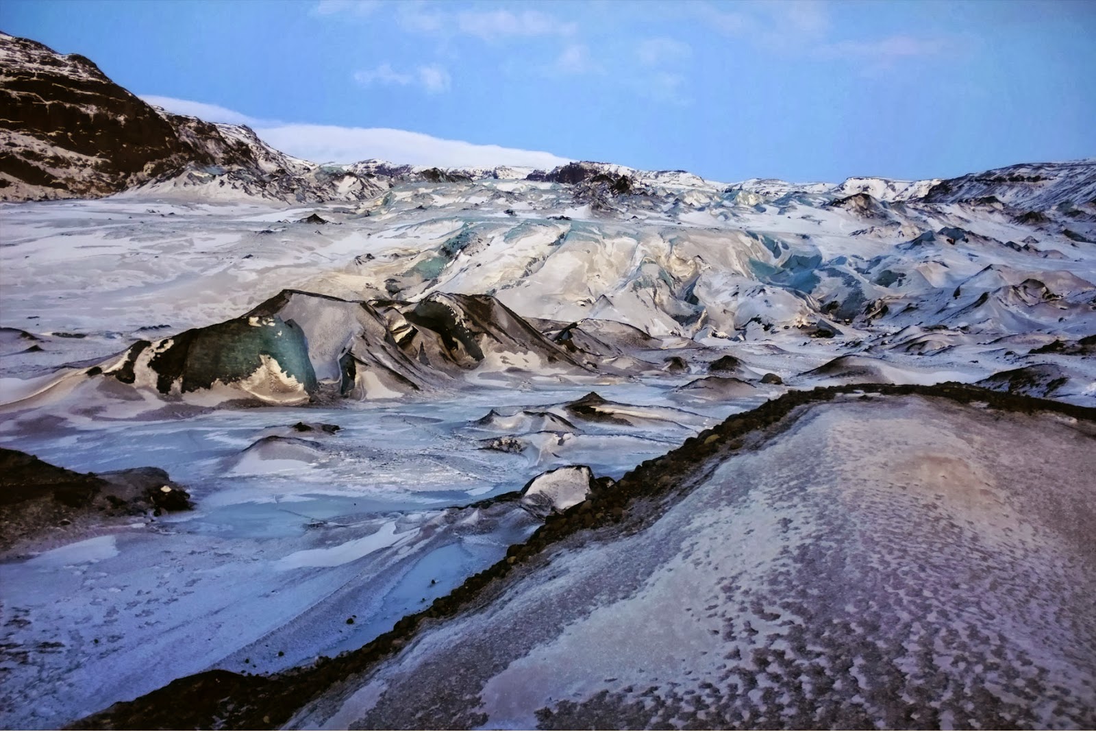 Desde Skogafoss nos fuimos a Solheimajokull, para llegar hay que coger una pista de tierra de unos 7 km que te lleva hasta una cefeteria. Desde allí hay dos rutas, una que va desde la playa hasta el glaciar y otra que va por el monte (puedes ir por una y volver por la otra). Muchas partes del glaciar son negras debido al polvo volcánico que se adhiere al hielo. Es una caminata de más o menos una hora (media de ida y media de vuelta más el rato que echas en el glaciar) que te lleva hasta los pies del glaciar.