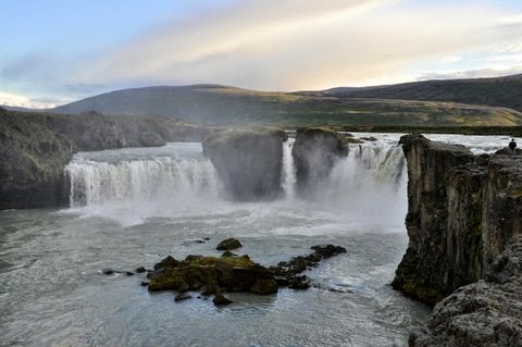 Seguimos por la 67 hasta Húsavík. Pueblo pesquero apiñado al lado del puerto, con bonita iglesia típica del país. Una vuelta comprar para la cena, todavía nos falta la visita de las cascada de Godafoss que es una de las cascadas más espectaculares de Islandia. El agua del río Skjálfandafljót cae desde una altura de 12 metros en una anchura de 30 m.