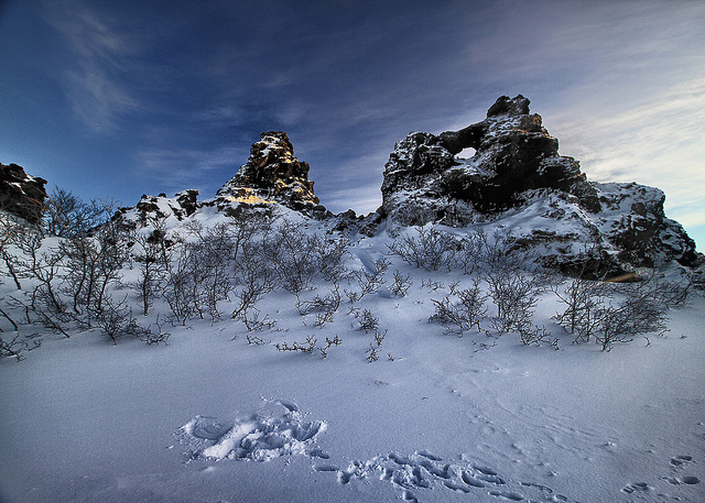 -Piérdete en las formaciones de lava de Dimmuborgir. Un gran lugar para ir de excursión, con senderos marcados que te llevan en torno a estas bellas formaciones naturales. Tenéis que tener cuidado con los trolls y elfos alrededor. El área Dimmuborgir está compuesta de varias cavernas y formaciones rocosas, los restos de actividad volcánica son quizá recuerdos de una antigua ciudadela derrumbada. Al arrojar columnas de vapor el lugar se atesta con humo sulfúrico.